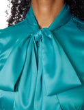 This elegant blouse in aqua, with pussy bow. The bow adds a distinctive feature, offering a unique and eye catching aspect to your outfit for both, smart and casual occasions. This blouse is made from 97% polyester, 3% elastane generating a satin texture which feels soft and luxurious. This adaptable and opulent shirt will enhance every wardrobe. The model is 5' 10" / 178 cm tall and wearing a UK size 8.