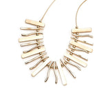 A striking alloy necklace in a matte gold and gold finish, featuring straight and curved design pieces.