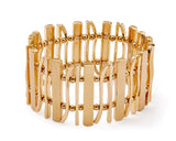 Striking brushed gold bracelet with both straight and curved designed pieces. Elasticated band means this bracelet is easy to put on and take off.