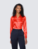 This stylish paprika blouse is crafted from a luxurious satin fabric with a sumptuously soft silk touch feel. Thanks to the high filament yarn, the material has the characteristics of silk whilst also being machine washable. Featuring a distinctive vintage collar and a flattering fitted silhouette. This adaptable and opulent shirt will enhance every wardrobe.