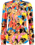 RED & BLUE DESIGNED SATIN FITTED BLOUSE - PUSSY BOW
