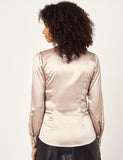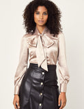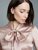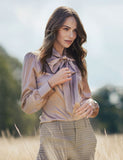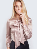 This elegant taupe blouse is a fashionable and indulgent addition to any women's attire. The bow adds a distinctive feature, offering a unique and eye catching aspect to your outfit. The bow is also self tied to allow for as large or small a bow as you wish.