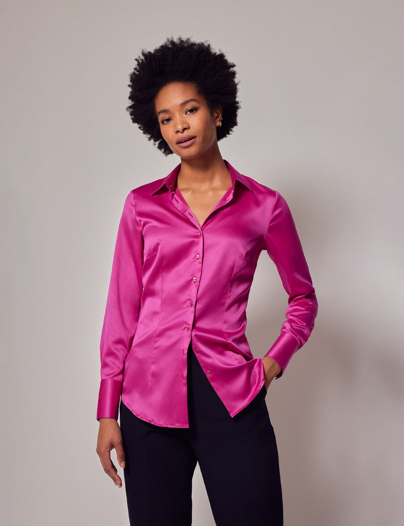 A must for any smart wardrobe, pick this sumptuous satin shirt in bright fuschia. The on-trend colour and elegant pointed collar accomodates a multitude of looks. Our fitted shirts have been flatteringly designed with darts at the waist and bust, creating a streamlined silhouette. This adaptable and opulent shirt will enhance every wardrobe.