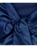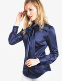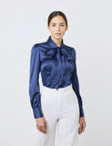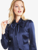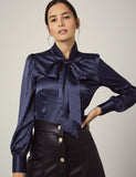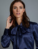 This elegant navy blouse is a fashionable and indulgent addition to any women's attire. The bow adds a distinctive feature, offering a unique and eye catching aspect to your outfit. The bow is also self tied which allows you to personalize your look.