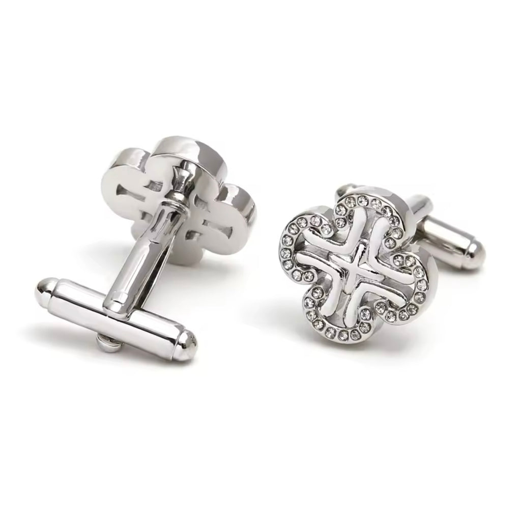 RHINESTONE silver CLOVER BUTTON FORMAL CUFFLINKS